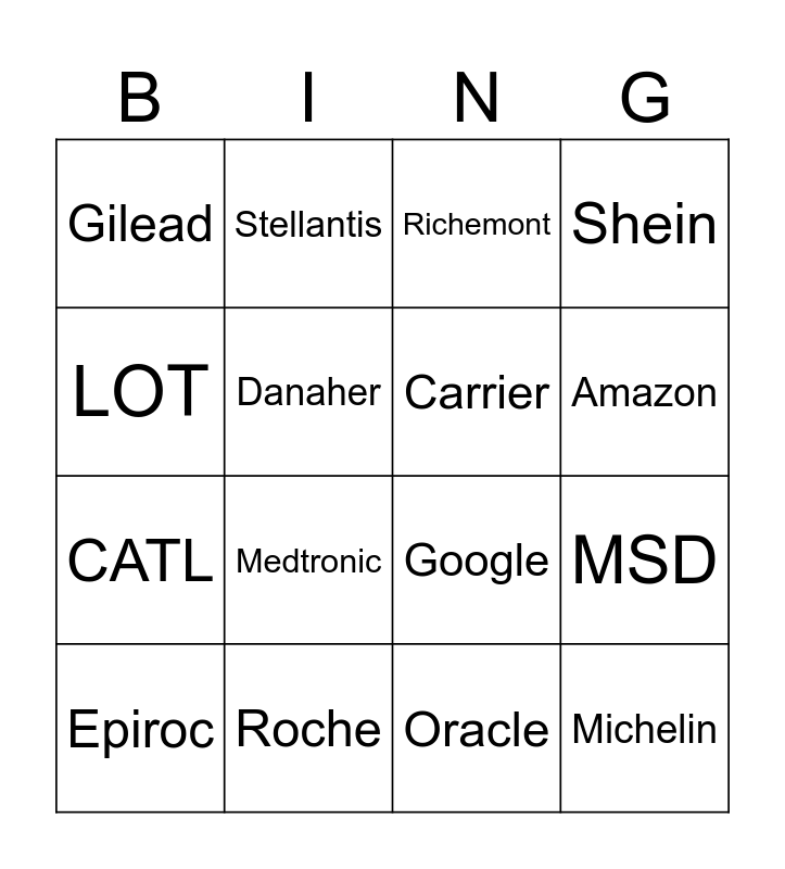 This bingo card has 88 words: Free!, Apple, ASML, Cisco, Dell, Hewlett Packard Enterprise, HP, Infineon, Intel, Lenovo, LXI, Meta, Nokia, Oracle, Texas Instruments, Amazon, Amore Pacific, Anta, Colgate-Palmolive, eBay, EssilorLuxottica, Estee Lauder, Google, H&M, Inditex, L’Oréal, LVMH, Nike, Prada, Puma, Richemont, Shein, Abbott, AstraZeneca, Bayer, Danaher, Gilead, GSK, Lilly, Medtronic, MSD, Novartis, Philips, Pfizer, Roche, Sanofi, Thermo Fisher Scientific, BMW, Bosch, CATL, CNH, Continental, Ford, Geely, Goodyear, Hyundai, Michelin, Stellantis, Tata, Tesla, Toyota, Volkswagen, Volvo, 3M, ABB, Air France KLM Group, Airbus, Carrier, Caterpillar, Epiroc, Honeywell, IAG, Komatsu, LOT, Metso, Riyadh Air, Safran, Sandvik, Siemens, Trane, Baker Hughes, Grundfos, Halliburton, Hitachi, LONGi, Siemens Energy, SLB and TOTO.