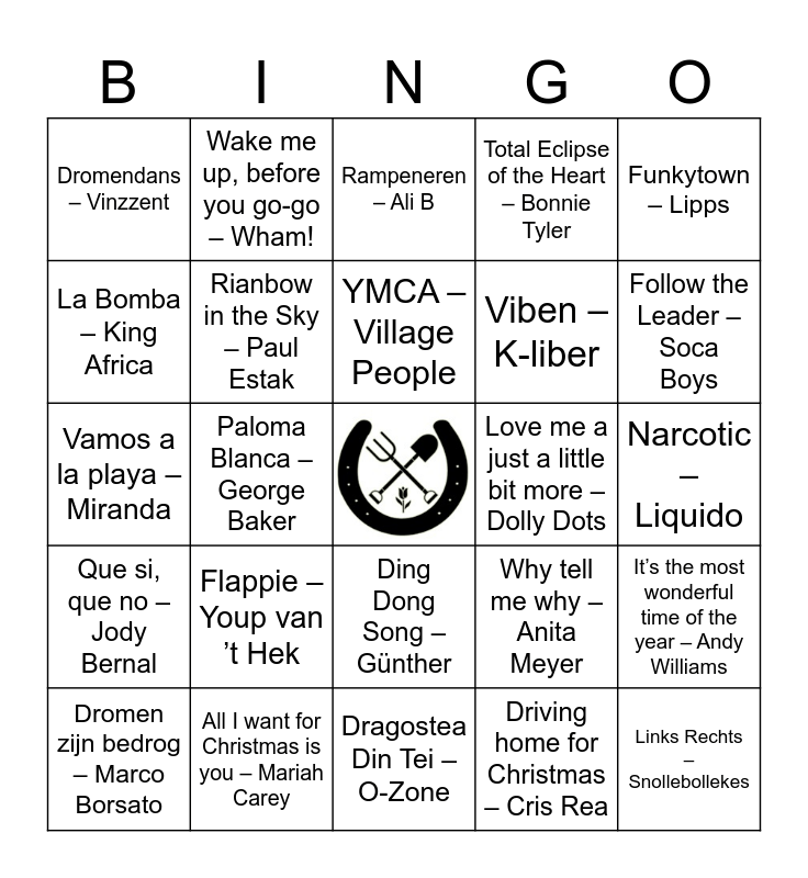 This bingo card has a free space and 56 words: Ich bin wie du – Marianne Rosenberg, Dromen zijn bedrog – Marco Borsato, Ademnood – Linda, Roos en Jessica, Dromendans – Vinzzent, Dragostea Din Tei – O-Zone, Casanova – Ultimate Kaos, Rianbow in the Sky – Paul Estak, Captain Jack – Captain Jack, Viben – K-liber, Leef – André Hazes, Total Eclipse of the Heart – Bonnie Tyler, Oops… I did it again – Britney Spears, Girls just wanna have fun – Cyndi Lauper, Mexico – Zangeres zonder naam, Uptown Girl – Westlife, Daddy Cool – Boney M., Funkytown – Lipps, Paloma Blanca – George Baker, Boom, Boom, Boom, Boom – Vengaboys, Links Rechts – Snollebollekes, Love me a just a little bit more – Dolly Dots, 99 Luftballons – Nena, Why tell me why – Anita Meyer, Rampeneren – Ali B, Paradise by the Dashboard light – Meat Loaf, YMCA – Village People, Macarena – Los del Rio, I like to move it – Reel 2 Real, Follow the Leader – Soca Boys, Atje voor de sfeer – René Karst, Take on me – A-ha, Anton aus Tirol – DJ Ötzi, Waterloo – ABBA, Eye of the tiger – Survivor, Narcotic – Liquido, La Bomba – King Africa, Vamos a la playa – Miranda, Grease Lightnin’ – Grease, Que si, que no – Jody Bernal, Wake me up, before you go-go – Wham!, Ding Dong Song – Günther, Heb je even voor mij – Frans Bauer, Bloemkôle – Oôs Joôs, Mamma, woar is mien pils – Normaal, Ik kan geen kikker van de kant afduwen – Lowland Trio, Flappie – Youp van ’t Hek, All I want for Christmas is you – Mariah Carey, Jingle Bell Rock – Bobby Helms, Rockin’Around the Christmas Tree – Brenda Lee, Last Christmas – Wham!, Driving home for Christmas – Cris Rea, Beuk de ballen uit de boom – Snollebollekes, Do they know it’s Christmas? – Band Aid, Rudolph the red-nosed reindeer – Dean Martin, It’s the most wonderful time of the year – Andy Williams and Santa Claus is coming to town – Jackson 5.