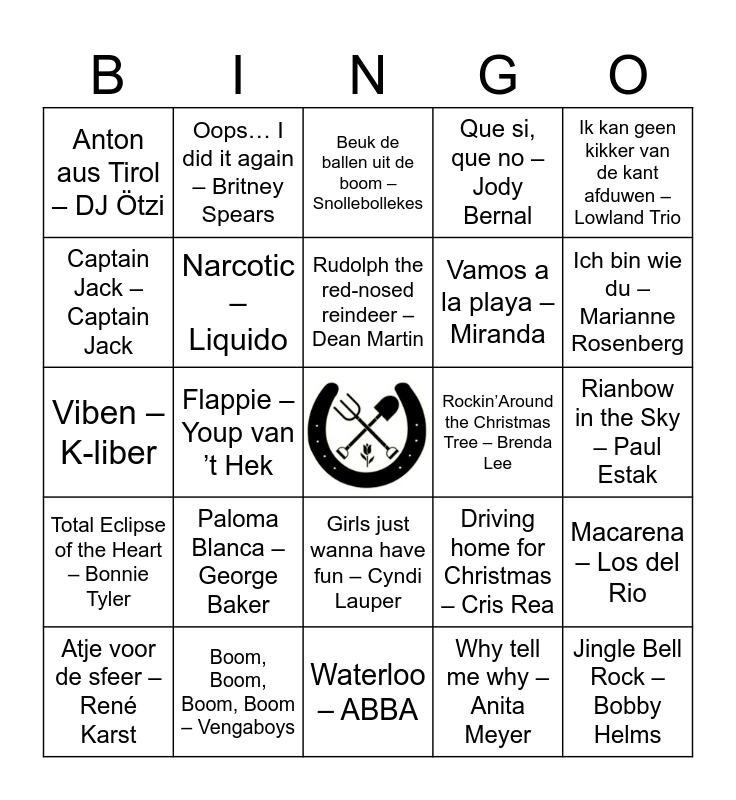 This bingo card has a free space and 56 words: Follow the Leader – Soca Boys, Atje voor de sfeer – René Karst, Take on me – A-ha, Anton aus Tirol – DJ Ötzi, Waterloo – ABBA, Eye of the tiger – Survivor, Narcotic – Liquido, La Bomba – King Africa, Vamos a la playa – Miranda, Grease Lightnin’ – Grease, Que si, que no – Jody Bernal, Wake me up, before you go-go – Wham!, Ding Dong Song – Günther, Heb je even voor mij – Frans Bauer, Bloemkôle – Oôs Joôs, Mamma, woar is mien pils – Normaal, Ik kan geen kikker van de kant afduwen – Lowland Trio, Flappie – Youp van ’t Hek, All I want for Christmas is you – Mariah Carey, Jingle Bell Rock – Bobby Helms, Rockin’Around the Christmas Tree – Brenda Lee, Last Christmas – Wham!, Driving home for Christmas – Cris Rea, Beuk de ballen uit de boom – Snollebollekes, Do they know it’s Christmas? – Band Aid, Rudolph the red-nosed reindeer – Dean Martin, It’s the most wonderful time of the year – Andy Williams, Santa Claus is coming to town – Jackson 5, Ich bin wie du – Marianne Rosenberg, Dromen zijn bedrog – Marco Borsato, Ademnood – Linda, Roos en Jessica, Dromendans – Vinzzent, Dragostea Din Tei – O-Zone, Casanova – Ultimate Kaos, Rianbow in the Sky – Paul Estak, Captain Jack – Captain Jack, Viben – K-liber, Leef – André Hazes, Total Eclipse of the Heart – Bonnie Tyler, Oops… I did it again – Britney Spears, Girls just wanna have fun – Cyndi Lauper, Mexico – Zangeres zonder naam, Uptown Girl – Westlife, Daddy Cool – Boney M., Funkytown – Lipps, Paloma Blanca – George Baker, Boom, Boom, Boom, Boom – Vengaboys, Links Rechts – Snollebollekes, Love me a just a little bit more – Dolly Dots, 99 Luftballons – Nena, Why tell me why – Anita Meyer, Rampeneren – Ali B, Paradise by the Dashboard light – Meat Loaf, YMCA – Village People, Macarena – Los del Rio and I like to move it – Reel 2 Real.