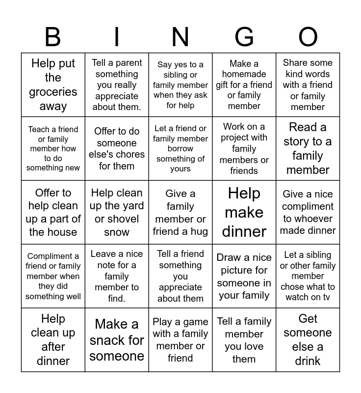 This bingo card has 25 words: Leave a nice note for a family member to find., Play a game with a family member or friend, Let a friend or family member borrow something of yours, Help clean up after dinner, Share some kind words with a friend or family member, Help put the groceries away, Teach a friend or family member how to do something new, Tell a parent something you really appreciate about them., Help make dinner, Tell a friend something you appreciate about them, Work on a project with family members or friends, Offer to help clean up a part of the house, Draw a nice picture for someone in your family, Let a sibling or other family member chose what to watch on tv, Offer to do someone else's chores for them, Get someone else a drink, Give a nice compliment to whoever made dinner, Say yes to a sibling or family member when they ask for help, Read a story to a family member, Help clean up the yard or shovel snow, Give a family member or friend a hug, Make a snack for someone, Compliment a friend or family member when they did something well, Make a homemade gift for a friend or family member and Tell a family member you love them.