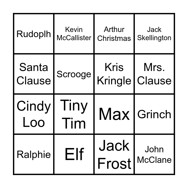This bingo card has 16 words: Elf, Grinch, Arthur Christmas, Rudoplh, Cindy Loo, Kevin McCallister, Max, Jack Frost, Santa Clause, Scrooge, Ralphie, Jack Skellington, Tiny Tim, Mrs. Clause, Kris Kringle and John McClane.