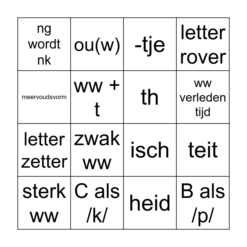 This bingo card has 22 words: C als /k/, C als /s/, ou(w), au(w), ww + t, th, ng wordt nk, -tje, isch, B als /p/, letter zetter, letter rover, i als /ie/, 'S, heid, tijd, teit, sterk ww, zwak ww, meervoudsvorm, ww verleden tijd and ww tegenwoordige tijd.