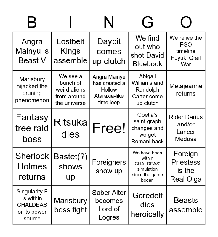 This bingo card has a free space and 24 words: Bastet(?) shows up, Marisbury boss fight, Angra Mainyu has created a Hollow Ataraxia-like time loop, Singularity F is within CHALDEAS or its power source, We relive the FGO timeline Fuyuki Grail War, Angra Mainyu is Beast V, Marisbury hijacked the pruning phenomenon, Lostbelt Kings assemble, Goetia's saint graph changes and we get Romani back, Foreigners show up, Abigail Williams and Randolph Carter come up clutch, Fantasy tree raid boss, We have been within CHALDEAS' simulation since the game began, Foreign Priestess is the Real Olga, We see a bunch of weird aliens from around the universe, Goredolf dies heroically, Rider Darius and/or Lancer Medusa, Daybit comes up clutch, Metajeanne returns, Ritsuka dies, Beasts assemble, Sherlock Holmes returns, We find out who shot David Bluebook and Saber Alter becomes Lord of Logres.