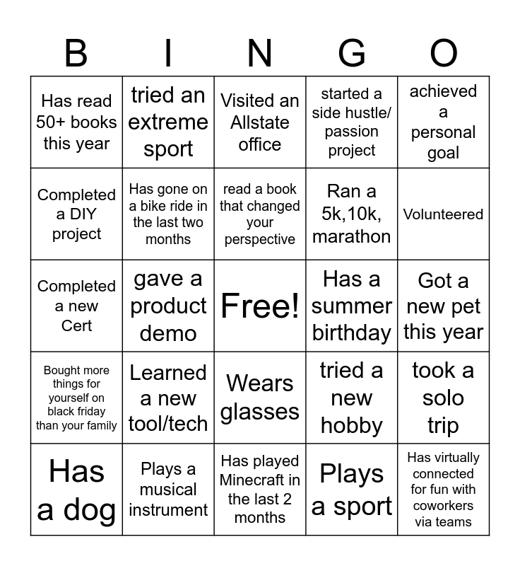 This bingo card has a free space and 29 words: Has a dog, worked from a different location than usual, gave a product demo, Travelled overseas this year, Has read 50+ books this year, Visited an Allstate office, Has gone on a bike ride in the last two months, Learned a new tool/tech, Has a summer birthday, Plays a musical instrument, Got a new pet this year, Has virtually connected for fun with coworkers via teams, Has played Minecraft in the last 2 months, Plays a sport, Volunteered, Has two siblings, Wears glasses, Bought more things for yourself on black friday than your family, achieved a personal goal, Completed a new Cert, tried a new hobby, mentored someone outside your team, Ran a 5k,10k, marathon, Completed a DIY project, started a side hustle/ passion project, tried an extreme sport, took a solo trip, read a book that changed your perspective and completed a digital detox of at least 24 hrs.
