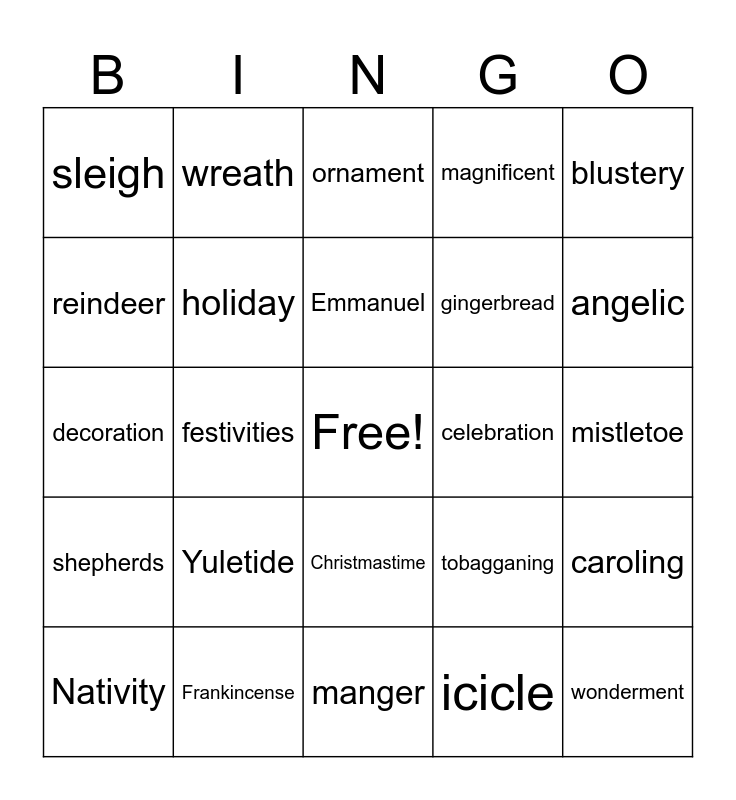 This bingo card has a free space and 24 words: Yuletide, Frankincense, Emmanuel, Nativity, blustery, sleigh, reindeer, wreath, celebration, Christmastime, gingerbread, decoration, tobagganing, caroling, holiday, icicle, mistletoe, ornament, angelic, festivities, wonderment, shepherds, magnificent and manger.