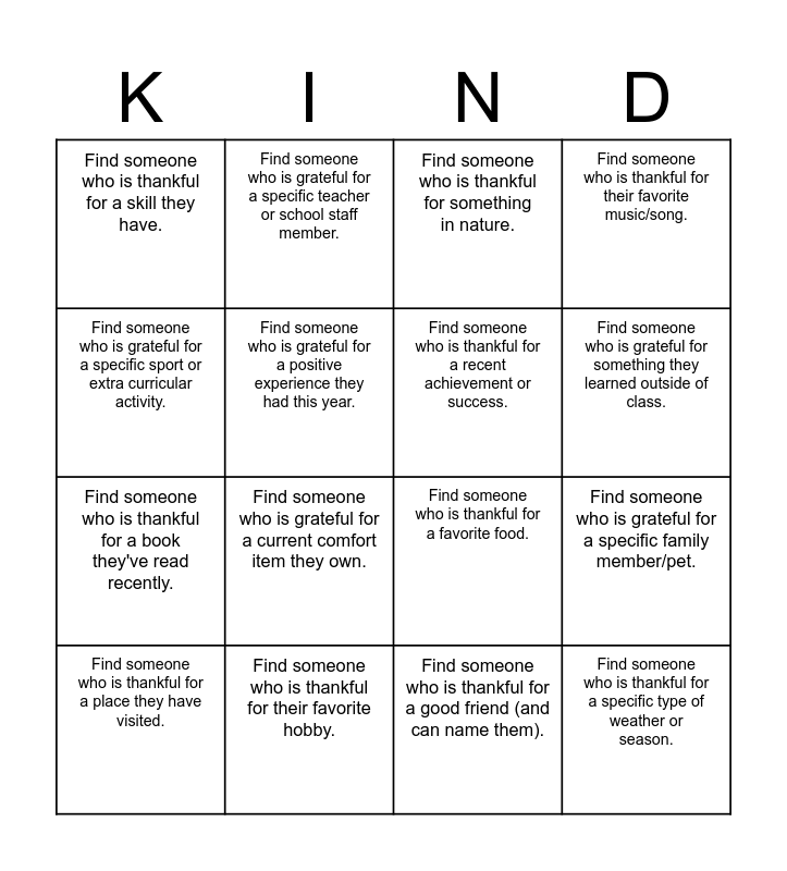 This bingo card has 16 words: Find someone who is thankful for their favorite hobby., Find someone who is grateful for a specific family member/pet., Find someone who is thankful for something in nature., Find someone who is thankful for a skill they have., Find someone who is thankful for a book they've read recently., Find someone who is grateful for a specific teacher or school staff member., Find someone who is thankful for a favorite food., Find someone who is thankful for a good friend (and can name them)., Find someone who is grateful for a specific sport or extra curricular activity., Find someone who is grateful for a positive experience they had this year., Find someone who is thankful for a place they have visited., Find someone who is thankful for their favorite music/song., Find someone who is grateful for a current comfort item they own., Find someone who is grateful for something they learned outside of class., Find someone who is thankful for a recent achievement or success. and Find someone who is thankful for a specific type of weather or season..