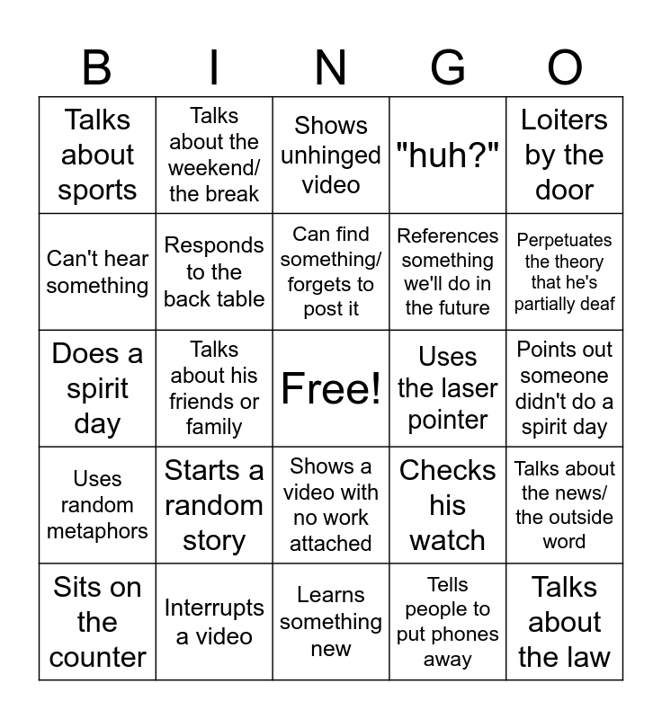This bingo card has a free space and 24 words: Starts a random story, Interrupts a video, Can find something/ forgets to post it, Sits on the counter, Loiters by the door, Talks about sports, Can't hear something, Talks about the weekend/ the break, Uses the laser pointer, Shows a video with no work attached, References something we'll do in the future, Does a spirit day, Checks his watch, Talks about the news/ the outside word, Responds to the back table, Tells people to put phones away, Points out someone didn't do a spirit day, Shows unhinged video, Perpetuates the theory that he's partially deaf, Talks about his friends or family, Talks about the law, Uses random metaphors, "huh?" and Learns something new.