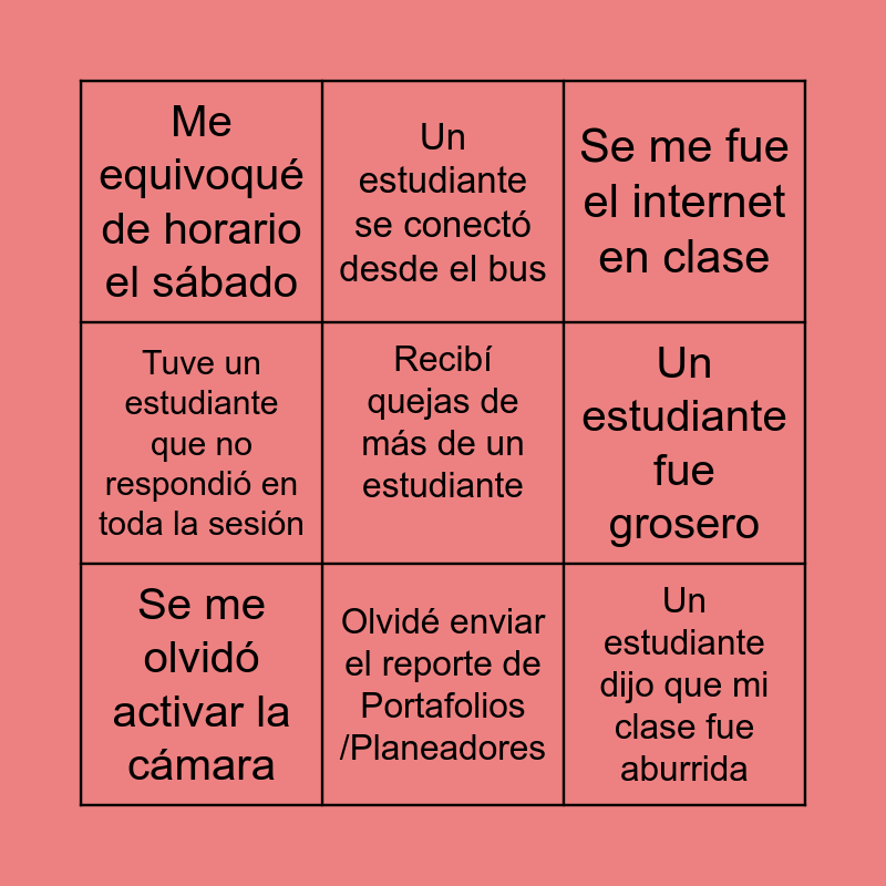 This bingo card has 38 words: No me bañé antes de iniciar jornada, Se me olvidó que debía reponer bloque, Llegó solo un estudiante justo a los 15 min, Se me olvidó activar la cámara, Se me hizo tarde para el primer bloque, Olvidé conectarme a link de ayuda, Olvidé enviar el reporte de Portafolios /Planeadores, Recibí queja de un estudiante, Recibí quejas de más de un estudiante, Un estudiante dijo que mi clase fue aburrida, Un estudiante dijo que mi clase fue la mejor, Tuve un estudiante que no respondió en toda la sesión, Se me fue la luz mientras estaba en clase, Se me olvidó enviar correo de culminación., Un estudiante fue grosero, Me pasé del tiempo del bloque, Tuve un estudiante que hacia muchas preguntas, Se me fue el internet en clase, Me incapacité dos veces o más, Me robaron un portafolio, Me equivoqué de horario el sábado, Le escribí a la coordi fuera de horario, Se me fue todo el bloque de quices con 3 estudiantes, Tenía asignación en vacaciones, Llegó un estudiante a tutoría pidiendo revisión del quiz, Me llamaron al link de ayuda y no contesté, Me llamaron al link de ayuda y no contesté, Me llamaron al link de ayuda y estaba comiendo, Mis vecinos hicieron ruido mientras estaba en clase, Un vendedor ambulante me interrumpió en clase/quiz, Se conectó un/a estudiante con un bebé, El estudiante olvida apagar su micrófono durante la sesión, El estudiante se conectó sin camisa, Un estudiante se conectó desde el bus, Revisé un escrito de examen final/portafolio y estaba hecho con IA., El estudiante quiere ver todos los temas de dos unidades en 1 tutoría., Creí que estaba compartiendo pantalla, pero no and Hablé un montón con el micrófono apagado.