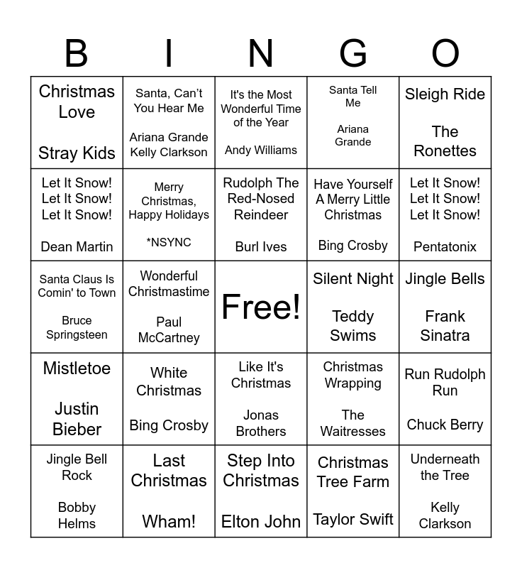 This bingo card has a free space and 60 words: All I Want for Christmas Is You Mariah Carey, Last Christmas Wham!, Rockin' Around The Christmas Tree Brenda Lee, Mistletoe Justin Bieber, Christmas Tree Farm Taylor Swift, Blue Christmas Elvis Presley, Merry Christmas, Happy Holidays *NSYNC, You're A Mean One, Mr. Grinch Thurl Ravenscroft, Have Yourself A Merry Little Christmas Bing Crosby, 24 to 25 Stray Kids, Santa Tell Me Ariana Grande, It's Beginning to Look a Lot like Christmas Michael Bublé, Let It Snow! Let It Snow! Let It Snow! Dean Martin, What Christmas Means to Me John Legend, santa doesn’t know you like i do Sabrina Carpenter, Christmas Love Stray Kids, Underneath the Tree Kelly Clarkson, Sleigh Ride The Ronettes, My Only Wish (This Year) Britney Spears, Rudolph The Red-Nosed Reindeer Burl Ives, Silent Night Teddy Swims, It's the Most Wonderful Time of the Year Andy Williams, Jingle Bell Rock Bobby Helms, Run Rudolph Run Chuck Berry, I Want a Hippopotamus for Christmas Gayla Peevey, Feliz Navidad José Feliciano, You're A Mean One, Mr. Grinch Boris Karlof, Merry Christmas Ed Sheeran Elton John, Let It Snow! Let It Snow! Let It Snow! Pentatonix, Where Are You Christmas Faith Hill, I'll Be Home For Christmas Seth MacFarlane, One More Sleep Leona Lewis, Deck The Hall Nat King Cole, Mele Kalikimaka Bing Crosby, Santa, Can’t You Hear Me Ariana Grande Kelly Clarkson, Have Yourself A Merry Little Christmas Frank Sinatra, Snowman Sia, Wonderful Christmastime Paul McCartney, The Christmas Song Nat King Cole, Santa Claus Is Comin' to Town Bruce Springsteen, Here Comes Santa Claus Gene Autry, White Christmas Bing Crosby, Jingle Bells Frank Sinatra, Frosty The Snowman Ella Fitzgerald, Christmas Wrapping The Waitresses, Holly Jolly Christmas Michael Bublé, It Feels Like Christmas Fall Out Boy, Carol of the Bells John Williams, A Nonsense Christmas Sabrina Carpenter, Like It's Christmas Jonas Brothers, Step Into Christmas Elton John, Santa Baby Laufey, Little Saint Nick The Beach Boys, It's Beginning to Look a Lot Like Christmas Perry Como, Hard Candy Christmas Dolly Parton, I Wish It Could Be Christmas Everyday Wizzard, This Christmas Donny Hathaway, Someday At Christmas Stevie Wonder, Christmas Lights Coldplay and Grandma Got Run over by a Reindeer Elmo & Patsy.