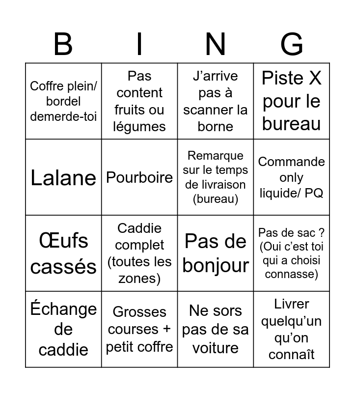 This bingo card has 16 words: Grosses courses + petit coffre, Pas de sac ? (Oui c’est toi qui a choisi connasse), J’arrive pas à scanner la borne, Coffre plein/ bordel demerde-toi, Œufs cassés, Pas content fruits ou légumes, Pas de bonjour, Ne sors pas de sa voiture, Lalane, Pourboire, Échange de caddie, Piste X pour le bureau, Caddie complet (toutes les zones), Commande only liquide/ PQ, Remarque sur le temps de livraison (bureau) and Livrer quelqu’un qu’on connaît.