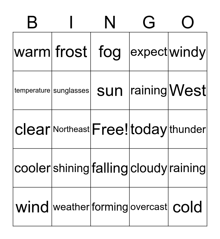 This bingo card has a free space and 24 words: shining, weather, sun, wind, windy, warm, temperature, frost, today, falling, raining, clear, cloudy, raining, sunglasses, overcast, thunder, fog, West, Northeast, cold, cooler, expect and forming.