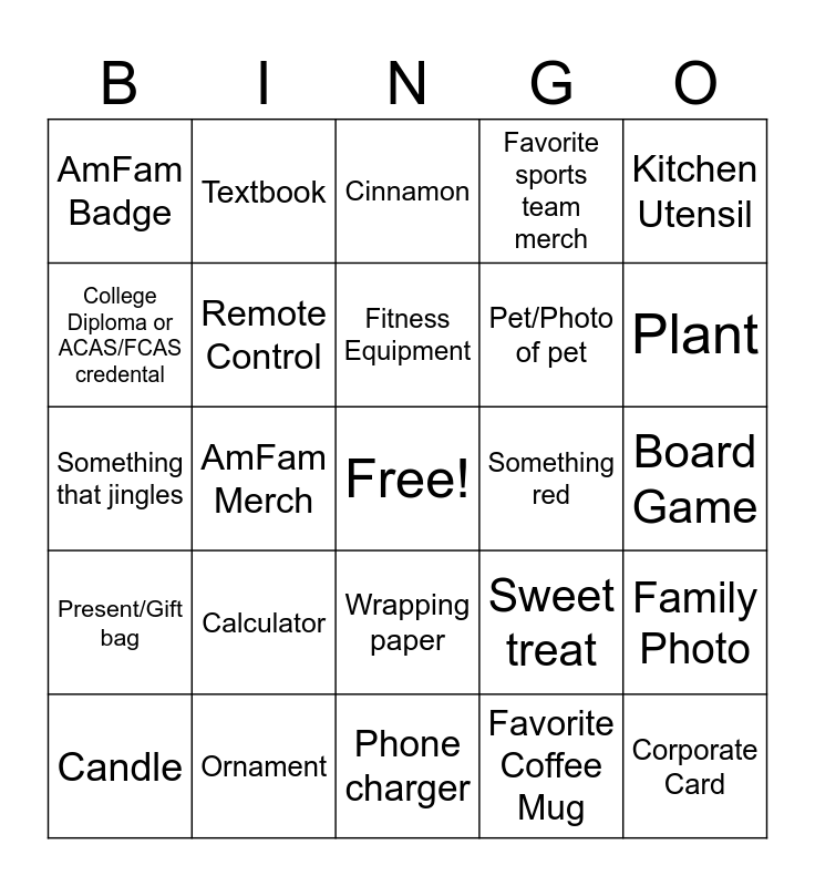 This bingo card has a free space and 24 words: Calculator, Ornament, Fitness Equipment, Candle, Kitchen Utensil, AmFam Badge, College Diploma or ACAS/FCAS credental, Textbook, Something red, Wrapping paper, Pet/Photo of pet, Something that jingles, Sweet treat, Family Photo, Remote Control, Favorite Coffee Mug, Board Game, Cinnamon, Plant, AmFam Merch, Corporate Card, Present/Gift bag, Favorite sports team merch and Phone charger.