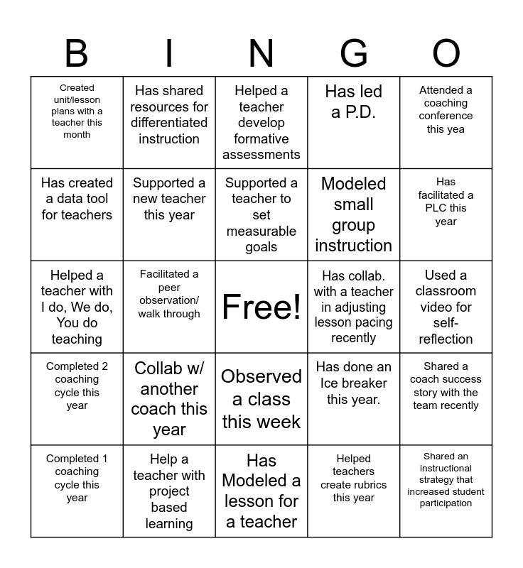 This bingo card has a free space and 24 words: Collab w/ another coach this year, Help a teacher with project based learning, Supported a teacher to set measurable goals, Completed 1 coaching cycle this year, Attended a coaching conference this yea, Created unit/lesson plans with a teacher this month, Has created a data tool for teachers, Has shared resources for differentiated instruction, Has collab. with a teacher in adjusting lesson pacing recently, Observed a class this week, Modeled small group instruction, Helped a teacher with I do, We do, You do teaching, Has done an Ice breaker this year., Shared a coach success story with the team recently, Supported a new teacher this year, Helped teachers create rubrics this year, Used a classroom video for self-reflection, Helped a teacher develop formative assessments, Has facilitated a PLC this year, Facilitated a peer observation/ walk through, Shared an instructional strategy that increased student participation, Completed 2 coaching cycle this year, Has led a P.D. and Has Modeled a lesson for a teacher.