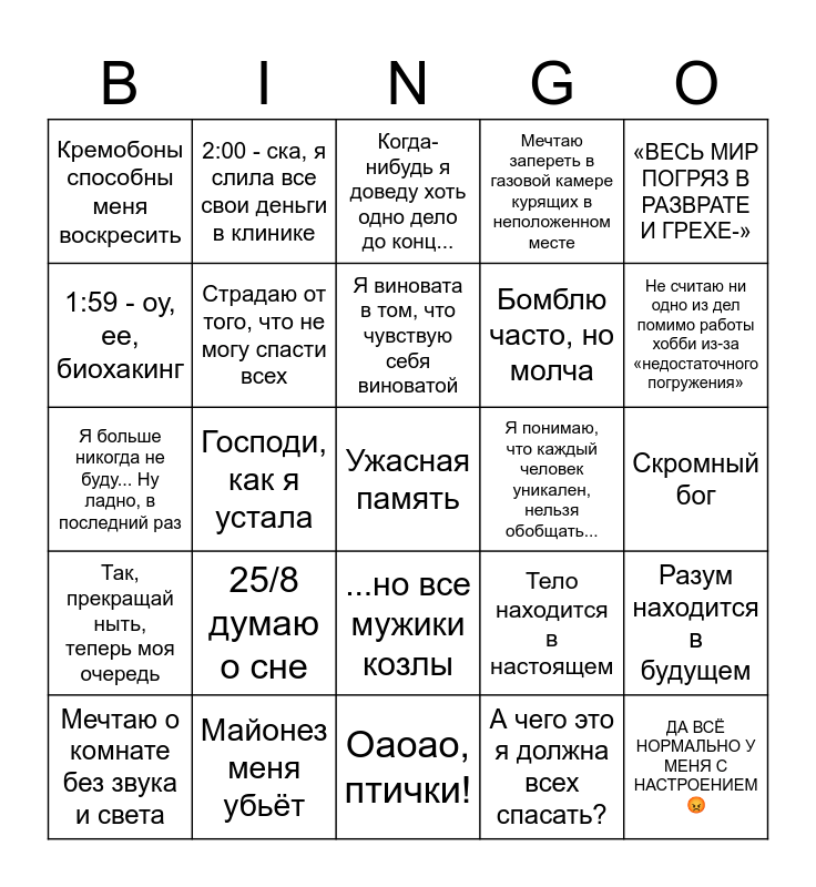 This bingo card has a free space and 24 words: 25/8 думаю о сне, Майонез меня убьёт, Я виновата в том, что чувствую себя виноватой, Мечтаю о комнате без звука и света, «ВЕСЬ МИР ПОГРЯЗ В РАЗВРАТЕ И ГРЕХЕ-», Кремобоны способны меня воскресить, 1:59 - оу, ее, биохакинг, 2:00 - ска, я слила все свои деньги в клинике, Я понимаю, что каждый человек уникален, нельзя обобщать..., ...но все мужики козлы, Бомблю часто, но молча, Я больше никогда не буду... Ну ладно, в последний раз, Тело находится в настоящем, Разум находится в будущем, Страдаю от того, что не могу спасти всех, А чего это я должна всех спасать?, Скромный бог, Когда-нибудь я доведу хоть одно дело до конц..., Не считаю ни одно из дел помимо работы хобби из-за «недостаточного погружения», Господи, как я устала, ДА ВСЁ НОРМАЛЬНО У МЕНЯ С НАСТРОЕНИЕМ 😡, Так, прекращай ныть, теперь моя очередь, Мечтаю запереть в газовой камере курящих в неположенном месте and Оаоао, птички!.