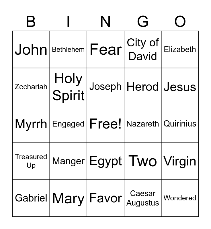 This bingo card has a free space and 24 words: Manger, Mary, Joseph, Gabriel, Elizabeth, John, Zechariah, Bethlehem, Nazareth, Egypt, Herod, Myrrh, Two, Virgin, Holy Spirit, Caesar Augustus, Quirinius, Fear, Jesus, Engaged, Wondered, Treasured Up, City of David and Favor.