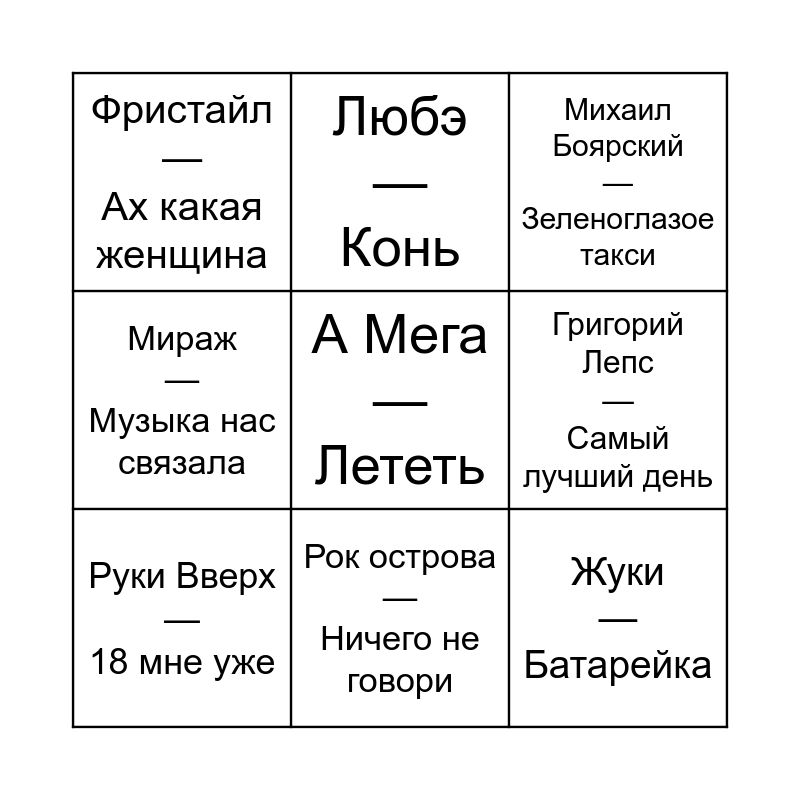 This bingo card has 36 words: Отпетые мошенники — Девушки бывают разные, Валерий Меладзе — Вера, Андрей Губин — Девушки как звёзды, Руки Вверх — 18 мне уже, Николай Носков — Это здорово, Кино — Видели ночь, Рок острова — Ничего не говори, Нэнси — Дым сигарет с ментолом, А Мега — Лететь, Андрей Губин — Ночь, Алла Пугачёва — Позови меня с собой, Мираж — Музыка нас связала, Мурат Насыров — Мальчик хочет в Тамбов, Шура — Ты не верь слезам, Леонид Агутин — Хоп хей, Фристайл — Ах какая женщина, Натали — Ветер с моря дул, Ирина Аллегрова — Угонщица, Григорий Лепс — Рюмка водки на столе, Михаил Боярский — Зеленоглазое такси, Кино — Пачка сигарет, Руки Вверх — Алёшка, Кипелов — Я свободен, Надежда Кадышева — Широка река, Ласковый май — Белые розы, Любэ — Конь, Гарик Сукачев — Моя бабушка курит трубку, Леприконсы — Хали-Гали, Жуки — Батарейка, Григорий Лепс — Самый лучший день, Юрий Шатунов — Седая ночь, Михаил Шуфутинский — 3 сентября, Земляне — Трава у дома, Король и Шут – Кукла колдуна, Найк Борзов – Верхом на звезде and Звери - Просто такая сильная любовь.