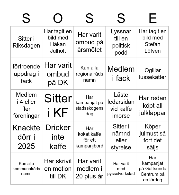 This bingo card has 30 words: Har skrivit en motion till DK, Har skrivit motion til AK, Sitter i KF, Sitter i RF, Sitter i Riksdagen, Har varit ombud på årsmötet, Har varit ombud på DK, Har kokat kaffe för ett kampanjbord, Läste ledarsidan vid kaffe imorse, Har varit medlem i 20 plus år, Har redan köpt all julklappar, Har kampanjat på stadsskogens dag, Har varit med pysselverkstad, Har kampanjat på Gottsunda Centrum på en lördag, Ogillar lussekatter, Åkte utomlands i året, Sitter i nämnd eller styrelse, Knackte dörr i 2025, Dricker inte kaffe, Har tagit en bild med Stefan Löfven, Medlem i 4 eller fler föreningar, Har tagit en bild med Magda, Har tagit en bild med Håkan Julholt, Medlem i fack, förtroende uppdrag i fack, Lyssnar till en politisk podd, Köper julmust så fort det säljs, Kan alla kommunalråds namn, Kan alla regionalråds namn and Planera kampanja valrörelsen 2026.