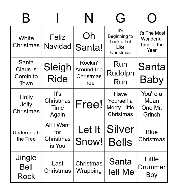 This bingo card has a free space and 24 words: All I Want for Christmas is You, Last Christmas, Rockin' Around the Christmas Tree, Jingle Bell Rock, It's The Most Wonderful Time of the Year, White Christmas, Santa Claus is Comin to Town, Feliz Navidad, Have Yourself a Merry Little Christmas, Let It Snow!, Run Rudolph Run, Holly Jolly Christmas, Silver Bells, Blue Christmas, Sleigh Ride, Santa Tell Me, You're a Mean One Mr. Grinch, Oh Santa!, Santa Baby, It's Christmas Time Again, Little Drummer Boy, Underneath the Tree, It's Beginning to Look a Lot Like Christmas and Christmas Wrapping.