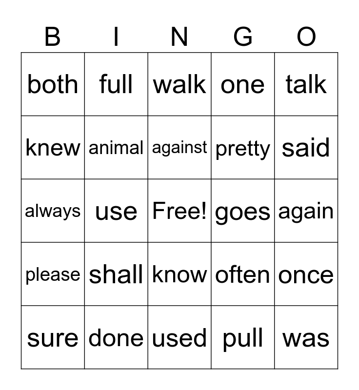 This bingo card has a free space and 24 words: shall, done, against, sure, talk, both, knew, full, goes, know, pretty, always, often, once, animal, pull, again, walk, said, use, was, please, one and used.