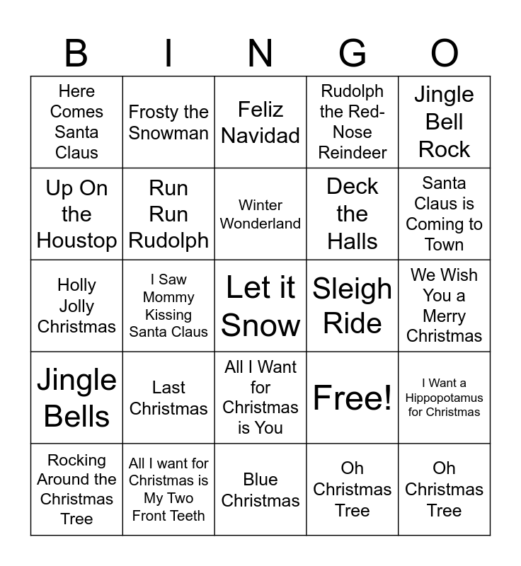 This bingo card has 25 words: Last Christmas, Blue Christmas, Winter Wonderland, Rocking Around the Christmas Tree, Jingle Bell Rock, Here Comes Santa Claus, Up On the Houstop, Frosty the Snowman, Sleigh Ride, All I Want for Christmas is You, Deck the Halls, Holly Jolly Christmas, Free!, I Want a Hippopotamus for Christmas, Run Run Rudolph, Oh Christmas Tree, We Wish You a Merry Christmas, Feliz Navidad, Santa Claus is Coming to Town, I Saw Mommy Kissing Santa Claus, Let it Snow, All I want for Christmas is My Two Front Teeth, Jingle Bells, Rudolph the Red-Nose Reindeer and Oh Christmas Tree.