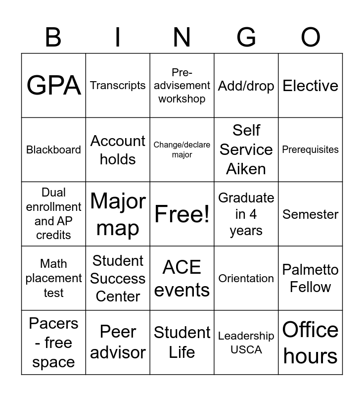 This bingo card has a free space and 35 words: 4pm advising appointment, 8am class, Academic advisor/coach, Account holds, ACE events, Add/drop, Blackboard, Career services, Change/declare major, DegreeWorks, Dual enrollment and AP credits, Elective, FAFSA, Gen ed, GPA, Graduate in 4 years, Leadership USCA, Major map, Math placement test, Office hours, Orientation, Pacers - free space, Palmetto Fellow, Peer advisor, Pre-advisement workshop, Prerequisites, Registration/time ticket, School or College Req., Self Service Aiken, Semester, Shopping cart, Student Life, Student Success Center, Transcripts and University 101.