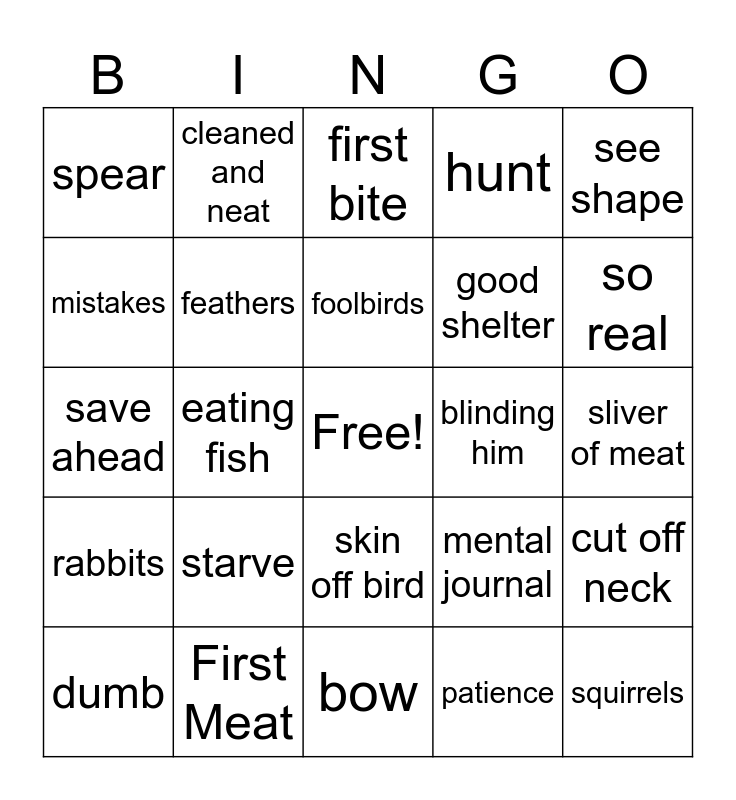 This bingo card has a free space and 24 words: starve, First Meat, foolbirds, dumb, see shape, spear, mistakes, cleaned and neat, blinding him, skin off bird, good shelter, save ahead, mental journal, cut off neck, feathers, patience, sliver of meat, first bite, so real, eating fish, squirrels, rabbits, hunt and bow.
