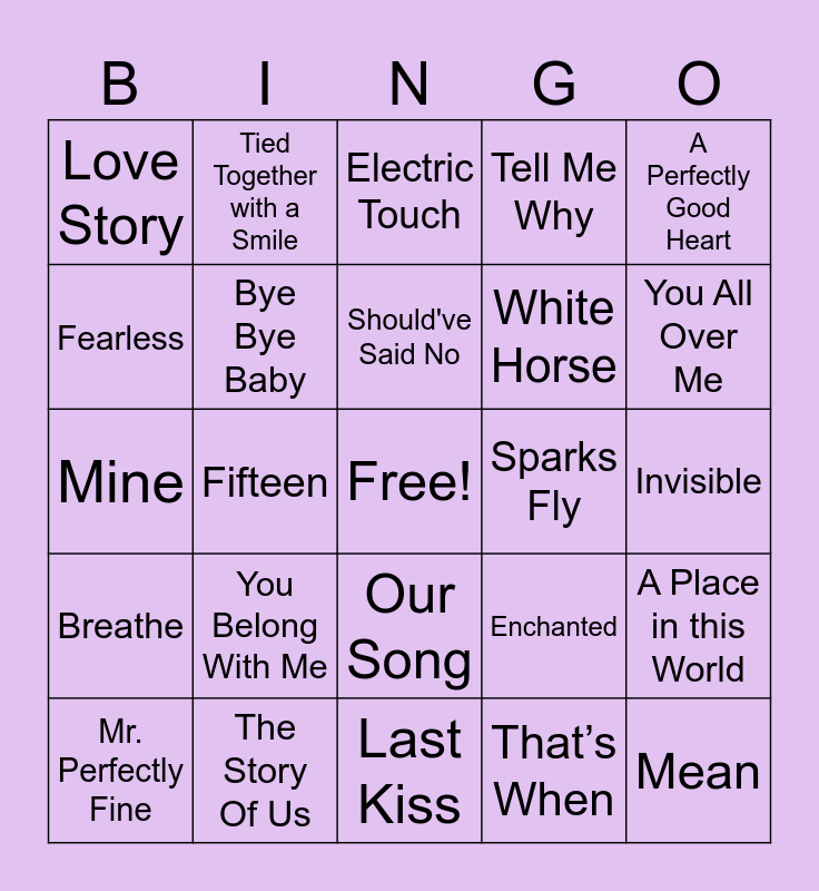 This bingo card has a free space and 64 words: Tim McGraw, Picture To Burn, Teardrops On My Guitar - Radio Single Remix, A Place in this World, Cold As You, The Outside, Tied Together with a Smile, Stay Beautiful, Should've Said No, Mary's Song, Our Song, I'm Only Me When I'm With You, Invisible, A Perfectly Good Heart, Teardrops on My Guitar, Fearless, Fifteen, Love Story, Hey Stephen, White Horse, You Belong With Me, Breathe, Tell Me Why, You’re Not Sorry, The Way I Loved You, Forever & Always, The Best Day, Change, Jump Then Fall, Untouchable, Come In With The Rain, Superstar, The Other Side Of The Door, Today Was A Fairytale, You All Over Me, Mr. Perfectly Fine, We Were Happy, That’s When, Don’t You, Bye Bye Baby, Mine, Sparks Fly, Back To December, Speak Now, Dear John, Mean, The Story Of Us, Never Grow Up, Enchanted, Better Than Revenge, Innocent, Haunted, Last Kiss, Long Live, Ours, Superman, Electric Touch, When Emma Falls in Love, I Can See You, Castles Crumbling, Foolish One, Timeless, Stay Stay Stay and Red.