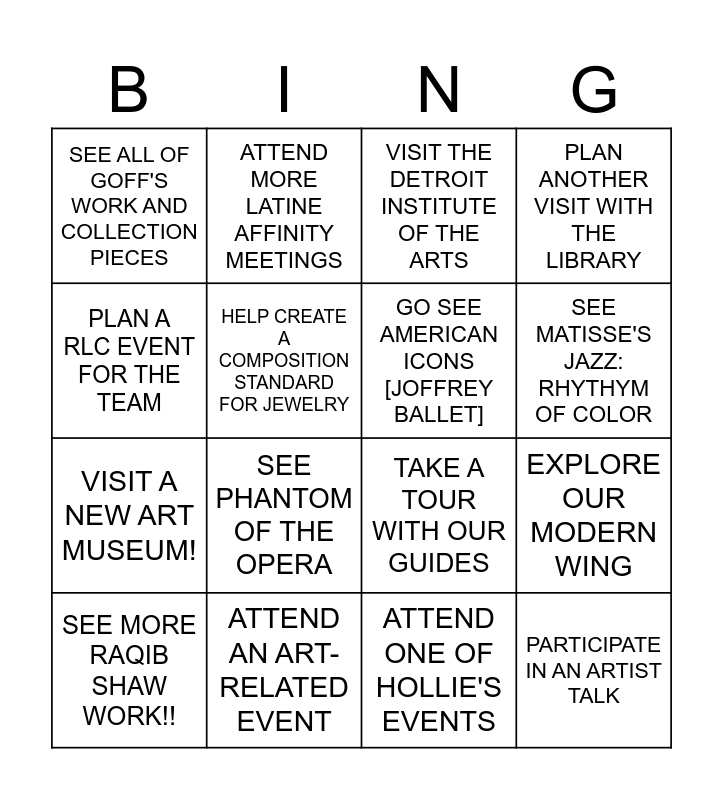 This bingo card has 16 words: SEE MORE RAQIB SHAW WORK!!, ATTEND AN ART-RELATED EVENT, VISIT THE DETROIT INSTITUTE OF THE ARTS, PLAN ANOTHER VISIT WITH THE LIBRARY, PLAN A RLC EVENT FOR THE TEAM, ATTEND MORE LATINE AFFINITY MEETINGS, TAKE A TOUR WITH OUR GUIDES, EXPLORE OUR MODERN WING, SEE ALL OF GOFF'S WORK AND COLLECTION PIECES, HELP CREATE A COMPOSITION STANDARD FOR JEWELRY, ATTEND ONE OF HOLLIE'S EVENTS, SEE MATISSE'S JAZZ: RHYTHYM OF COLOR, VISIT A NEW ART MUSEUM!, SEE PHANTOM OF THE OPERA, GO SEE AMERICAN ICONS [JOFFREY BALLET] and PARTICIPATE IN AN ARTIST TALK.