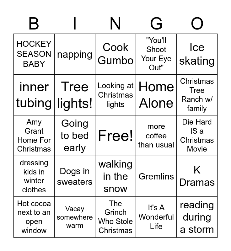 This bingo card has a free space and 24 words: Dogs in sweaters, Vacay somewhere warm, Looking at Christmas lights, Hot cocoa next to an open window, Ice skating, HOCKEY SEASON BABY, inner tubing, napping, more coffee than usual, walking in the snow, Home Alone, Amy Grant Home For Christmas, Gremlins, K Dramas, Tree lights!, It's A Wonderful Life, Die Hard IS a Christmas Movie, Cook Gumbo, Christmas Tree Ranch w/ family, Going to bed early, reading during a storm, dressing kids in winter clothes, "You'll Shoot Your Eye Out" and The Grinch Who Stole Christmas.