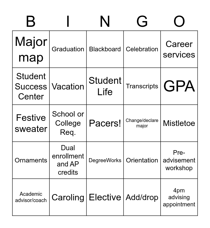 This bingo card has a free space and 44 words: 4:59 pm email, 4pm advising appointment, 8am class, Academic advisor/coach, ACE events, Add/drop, Blackboard, Candy CaneLane, Career services, Caroling, Celebration, Change/declare major, DegreeWorks, Dual enrollment and AP credits, Eggnog, Elective, FAFSA, Festive sweater, Gen ed, GPA, Graduation, Holiday Lights, Jingle Bells, Major map, Math placement test, Mistletoe, Noel, North Pole, Orientation, Ornaments, Peer advisor, Pre-advisement workshop, Prerequisites, Registration/time ticket, School or College Req., Self Service Aiken, Shopping cart, Stockings, Student Life, Student Success Center, Transcripts, University 101, Vacation and Winter Break.