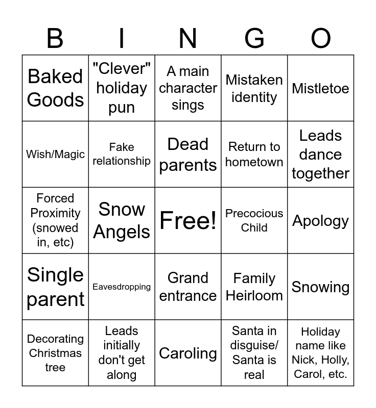 This bingo card has a free space and 60 words: Chance encounter/meet-cute, Leads initially don't get along, Travel problems, Single parent, Santa in disguise/ Santa is real, No Christmas Spirit, Fake relationship, Wealthy Scrooge type, Return to hometown, Going out of business, Mistaken identity, Royalty, Wish/Magic, Buying a Christmas Tree, Hot cocoa, Baked Goods, Holiday name like Nick, Holly, Carol, etc., Mistletoe, Ice Skating, Dead parents, Precocious Child, A main character sings, Decorating Christmas tree, Snowing, Santa has a son or daughter, Longing looks, Kiss between leads, Obvious CGI/backgrounds, Leads dance together, Friends reminds MC to follow their passion, Stroll down Main Street, Carriage or Hay Ride, Fire in Fireplace, New job, "Clever" holiday pun, Change of Heart, MC asks parents how they knew Mom/Dad was "The One", Snow Angels, Reference to "Big City", Forced Proximity (snowed in, etc), MC has a secret, Eavesdropping, Apology, Reconciliation, Family Heirloom, Jacket or Scarf shared, Recognize a washed up Actor, Product Placement, Saving family business, Grand entrance, Caroling, Gazebo, Snow globe, Shopping for gifts, Flannel, Bells, Elf, Christmas fanatic, Fundraiser and Ugly Christmas sweater.