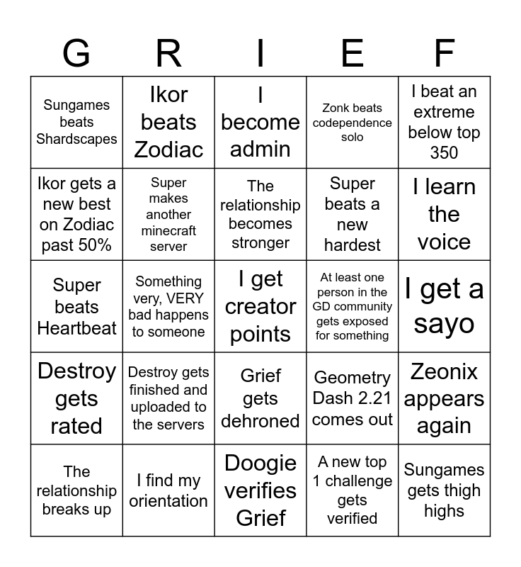 This bingo card has 25 words: Destroy gets finished and uploaded to the servers, Doogie verifies Grief, The relationship becomes stronger, The relationship breaks up, I beat an extreme below top 350, Sungames beats Shardscapes, Ikor gets a new best on Zodiac past 50%, Ikor beats Zodiac, At least one person in the GD community gets exposed for something, Grief gets dehroned, Super beats a new hardest, Super beats Heartbeat, Geometry Dash 2.21 comes out, Zeonix appears again, Super makes another minecraft server, Sungames gets thigh highs, I get a sayo, I become admin, I learn the voice, Something very, VERY bad happens to someone, I get creator points, I find my orientation, Destroy gets rated, Zonk beats codependence solo and A new top 1 challenge gets verified.