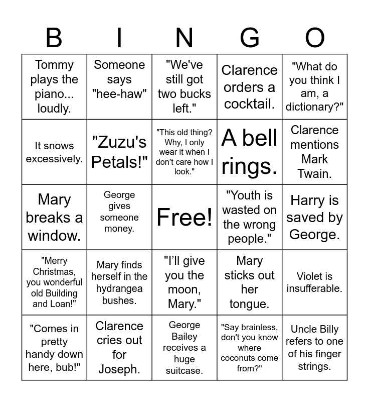 This bingo card has a free space and 32 words: "Say brainless, don't you know where coconuts come from?", "Not a smidgen of temperature!", George gives someone money., "George Bailey, I'll love you 'til the day I die.", "Merry Christmas, you wonderful old Building and Loan!", "Zuzu's Petals!", "What do you think I am, a dictionary?", Violet is insufferable., Someone says "hee-haw", "My mouth's bleedin'!", "This old thing? Why, I only wear it when I don’t care how I look.", "We've still got two bucks left.", George gets his ear slapped back by the druggist., It snows excessively., "Youth is wasted on the wrong people.", "Ideals without common sense can ruin this town.", "Comes in pretty handy down here, bub!", Mary breaks a window., "I’ll give you the moon, Mary.", Mary finds herself in the hydrangea bushes., Mary sticks out her tongue., You call this a happy family? Why do we have to have all these kids?, Harry is saved by George., Clarence cries out for Joseph., Uncle Billy refers to one of his finger strings., Clarence orders a cocktail., A bell rings., It snows excessively., Tommy plays the piano... loudly., George Bailey receives a huge suitcase., Harry receives accolades. and Clarence mentions Mark Twain..