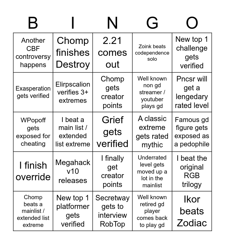 This bingo card has a free space and 24 words: Megahack v10 releases, New top 1 platformer gets verified, Chomp gets creator points, Chomp beats a mainlist / extended list extreme, New top 1 challenge gets verified, Another CBF controversy happens, Exasperation gets verified, Chomp finishes Destroy, A classic extreme gets rated mythic, I finally get creator points, Well known non gd streamer / youtuber plays gd, WPopoff gets exposed for cheating, Underrated level gets moved up a lot in the mainlist, I beat the original RGB trilogy, Elirpscalion verifies 3+ extremes, Well known retired gd player comes back to play gd, Famous gd figure gets exposed as a pedophile, 2.21 comes out, Pncsr will get a lengedary rated level, I beat a main list / extended list extreme, Ikor beats Zodiac, I finish override, Zoink beats codependence solo and Secretway gets to interview RobTop.