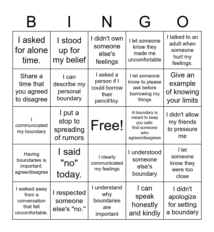 This bingo card has a free space and 24 words: I said "no" today., I respected someone else's "no.", I asked a person if I could borrow their pencil/toy., I walked away from a conversation that felt uncomfortable., I talked to an adult when someone hurt my feelings., I asked for alone time., Share a time that you agreed to disagree, I stood up for my belief, A boundary is meant to keep you safe: find someone who agrees/disagrees, I clearly communicated my feelings, I let someone know to please ask before borrowing my things, I communicated my boundary, I understood someone else's boundary, I let someone know they were too close, I can describe my personal boundary, I can speak honestly and kindly, I didn't allow my friends to pressure me, I didn't own someone else's feelings, Give an example of knowing your limits, I put a stop to spreading of rumors, I didn't apologize for setting a boundary, Having boundaries is important: agree/disagree, I let someone know they made me uncomfortable and I understand why boundaries are important.