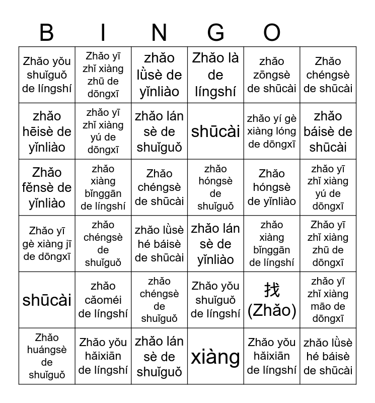 This bingo card has 60 words: zhǎo qiǎokèlì de língshí, zhǎo lán sè de yǐnliào, zhǎo zǐsè de shūcài, zhǎo hóngsè de shuǐguǒ, Zhǎo yī zhǐ xiàng zhū de dōngxī, zhǎo cǎoméi de língshí, zhǎo hēisè de yǐnliào, zhǎo báisè de shūcài, zhǎo lán sè de shuǐguǒ, zhǎo yí gè xiàng lóng de dōngxī, Zhǎo là de língshí, Zhǎo hóngsè de yǐnliào, Zhǎo chéngsè de shūcài, Zhǎo huángsè de shuǐguǒ, Zhǎo yī gè xiàng jī de dōngxī, Zhǎo yǒu shuǐguǒ de língshí, Zhǎo fěnsè de yǐnliào, zhǎo zōngsè de shūcài, Zhǎo lǜsè de shuǐguǒ, zhǎo yī zhǐ xiàng yú de dōngxī, zhǎo xiàng bǐnggān de língshí, zhǎo lǜsè de yǐnliào, zhǎo lǜsè hé báisè de shūcài, zhǎo chéngsè de shuǐguǒ, zhǎo yī zhǐ xiàng māo de dōngxī, Zhǎo yǒu hǎixiān de língshí, 找 (Zhǎo), língshí, shūcài, xiàng, zhǎo qiǎokèlì de língshí, zhǎo lán sè de yǐnliào, zhǎo zǐsè de shūcài, zhǎo hóngsè de shuǐguǒ, Zhǎo yī zhǐ xiàng zhū de dōngxī, zhǎo cǎoméi de língshí, zhǎo hēisè de yǐnliào, zhǎo báisè de shūcài, zhǎo lán sè de shuǐguǒ, zhǎo yí gè xiàng lóng de dōngxī, Zhǎo là de língshí, Zhǎo hóngsè de yǐnliào, Zhǎo chéngsè de shūcài, Zhǎo huángsè de shuǐguǒ, Zhǎo yī gè xiàng jī de dōngxī, Zhǎo yǒu shuǐguǒ de língshí, Zhǎo fěnsè de yǐnliào, zhǎo zōngsè de shūcài, Zhǎo lǜsè de shuǐguǒ, zhǎo yī zhǐ xiàng yú de dōngxī, zhǎo xiàng bǐnggān de língshí, zhǎo lǜsè de yǐnliào, zhǎo lǜsè hé báisè de shūcài, zhǎo chéngsè de shuǐguǒ, zhǎo yī zhǐ xiàng māo de dōngxī, Zhǎo yǒu hǎixiān de língshí, 找 (Zhǎo), língshí, shūcài and xiàng.