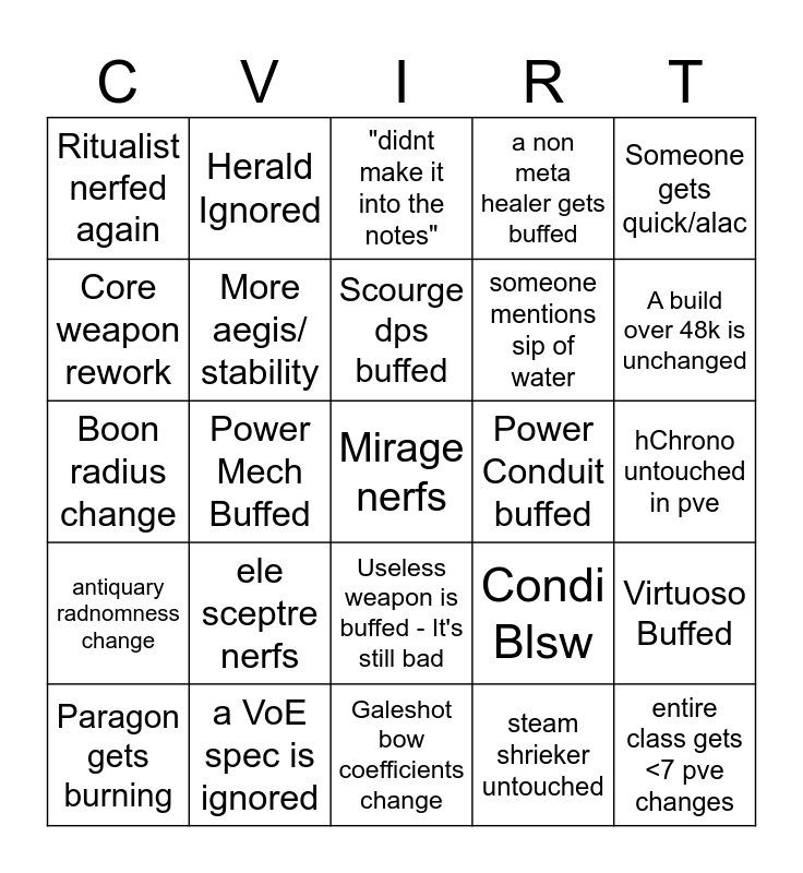 This bingo card has 25 words: ele sceptre nerfs, Galeshot bow coefficients change, Scourge dps buffed, Paragon gets burning, Someone gets quick/alac, Ritualist nerfed again, Core weapon rework, Herald Ignored, Power Conduit buffed, Useless weapon is buffed - It's still bad, someone mentions sip of water, Boon radius change, Condi Blsw, Virtuoso Buffed, More aegis/ stability, entire class gets <7 pve changes, hChrono untouched in pve, "didnt make it into the notes", A build over 48k is unchanged, Power Mech Buffed, Mirage nerfs, a VoE spec is ignored, antiquary radnomness change, a non meta healer gets buffed and steam shrieker untouched.