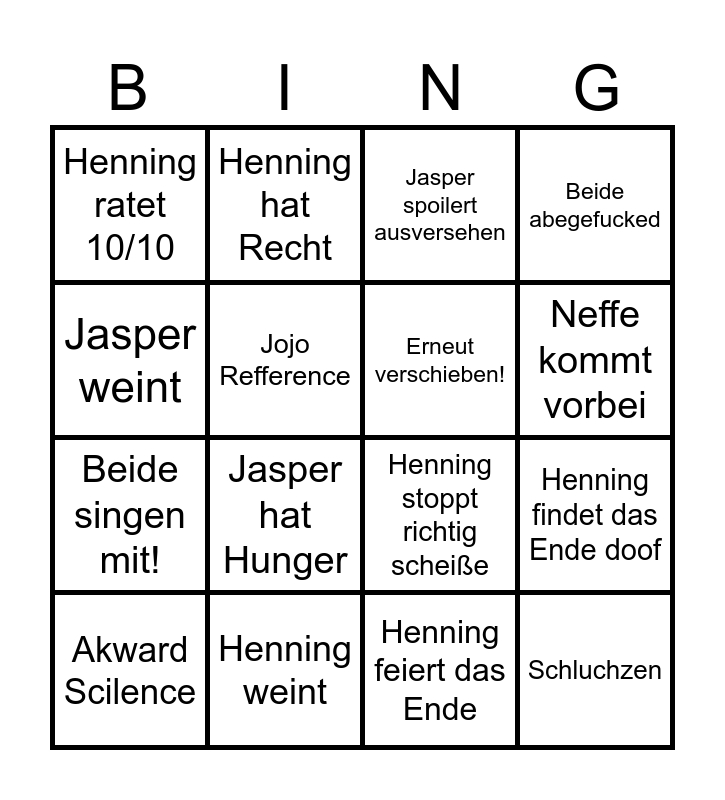This bingo card has 16 words: Henning weint, Henning findet das Ende doof, Jasper spoilert ausversehen, Henning ratet 10/10, Beide singen mit!, Henning hat Recht, Henning stoppt richtig scheiße, Henning feiert das Ende, Jasper weint, Jojo Refference, Akward Scilence, Beide abegefucked, Jasper hat Hunger, Neffe kommt vorbei, Erneut verschieben! and Schluchzen.