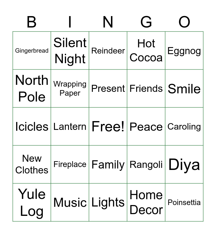This bingo card has a free space and 80 words: Santa, Sleigh, Reindeer, Rudolph, Elf, Stocking, Mistletoe, Holly, Garland, Wreath, Snowman, Snowflake, Hot Cocoa, Gingerbread, Candy Cane, North Pole, Ornament, Fireplace, Chimney, Caroling, Jingle Bells, Eggnog, Icicles, Present, Wrapping Paper, Snowball, Frosty, Toy Train, Cookies, Nutcracker, Smile, Christmas Tree, Lights, Merry, Yule Log, Peace, Noel, Winter, Sleigh Bells, Poinsettia, Festive, Joy, Good Cheer, Warm Scarf, Pine Cones, Silent Night, Candy, Star, Snow Boots, Holiday Spirit, Diya, Lantern, Rangoli, Fireworks, Sparklers, Sweets, Ladoo, Jalebi, Barfi, Family, Friends, Celebration, Tradition, Puja, Goddess Lakshmi, Prosperity, Blessings, Festival, Happiness, Gold, New Clothes, Music, Dance, Henna, Flowers, Marigold, Home Decor, Good Fortune, Victory of Light and Grinch.