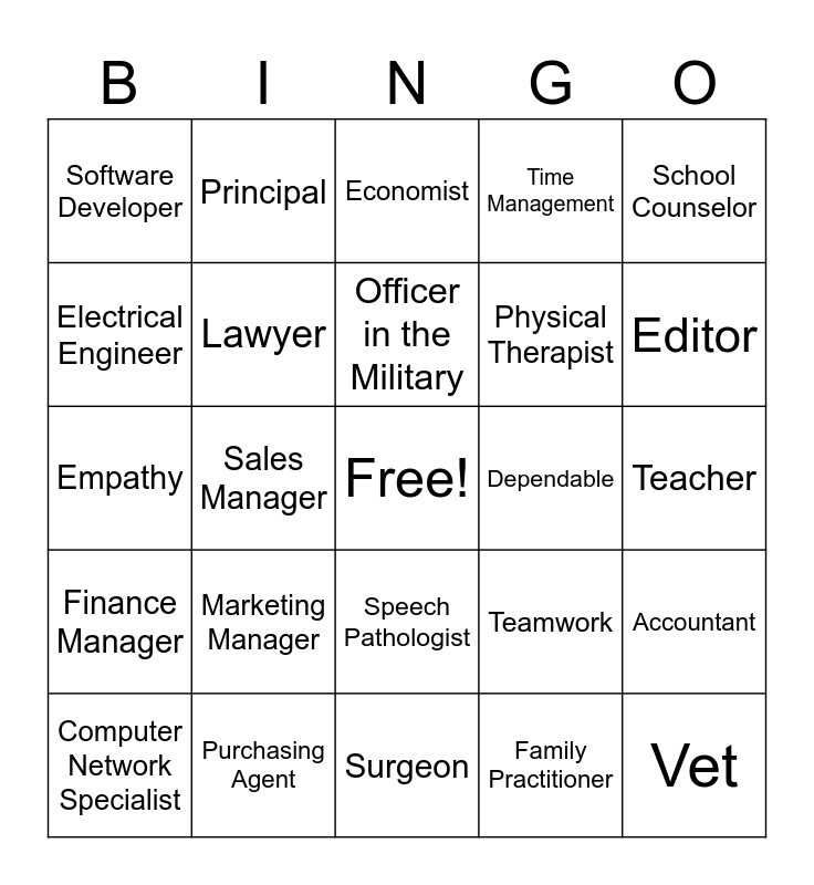 This bingo card has a free space and 24 words: Marketing Manager, Purchasing Agent, Officer in the Military, Computer Network Specialist, School Counselor, Software Developer, Electrical Engineer, Principal, Dependable, Speech Pathologist, Physical Therapist, Empathy, Teamwork, Accountant, Lawyer, Family Practitioner, Teacher, Economist, Editor, Sales Manager, Vet, Finance Manager, Time Management and Surgeon.