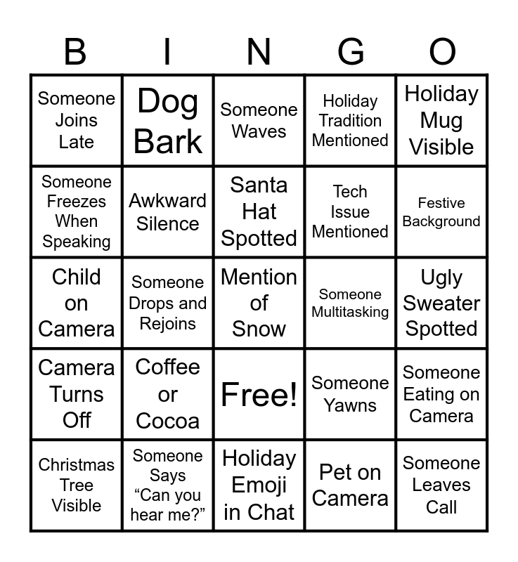 This bingo card has 26 words: Free!, Pet on Camera, Santa Hat Spotted, Someone Says “Can you hear me?”, Holiday Mug Visible, Someone Joins Late, Someone Freezes When Speaking, Dog Bark, Ugly Sweater Spotted, Someone Yawns, Tech Issue Mentioned, Child on Camera, Someone Eating on Camera, Christmas Tree Visible, Someone Drops and Rejoins, “You’re on mute”, Holiday Tradition Mentioned, Camera Turns Off, Someone Waves, Mention of Snow, Festive Background, Holiday Emoji in Chat, Someone Multitasking, Coffee or Cocoa, Awkward Silence and Someone Leaves Call.