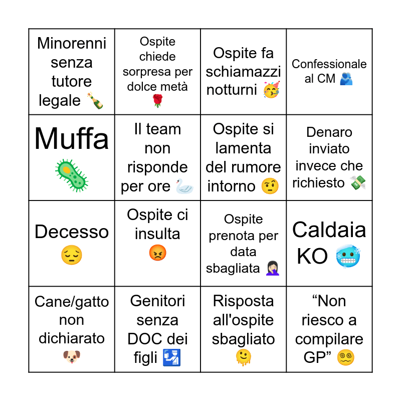 This bingo card has 32 words: Complimenti sinceri all’OUT 🥰, Sanitrit KO 💩, Caldaia KO 🥶, A/C o pompa di calore KO 🌡️🥶, “Non riesco a compilare GP” 😵💫, Ospite si lamenta del rumore intorno 🤨, Muffa 🦠, Furto eclatante 🥷🏻, Ospite chiede sorpresa per dolce metà🌹, Ospiti extra non dichiarati 🫣, Denaro inviato invece che richiesto 💸, Ospite fa schiamazzi notturni 🥳, Puzza di gas 😮💨, Destinatario mail errato! ✉️, Genitori senza DOC dei figli 🛂, Utenze KO 🚱, Ospite perde/rompe le chiavi 🔑, Ospite prenota per data sbagliata 🤦🏻♀️, Il robottino dice una ca**ata 🤖, Ospite fa schiamazzi notturni 🕺🏻, Ospite si dimentica di fare OUT 😴, Cancellazione preno sbagliata 🤯, Risposta all'ospite sbagliato 🫠, Ospite racconta la sua vita 🗣️, Cane/gatto non dichiarato 🐶, Confessionale al CM 🫂, Decesso 😔, Il team non risponde per ore 🦢, Minorenni senza tutore legale 🍾, “Ballerina” in apt 💃, “Non VOGLIO compilare GP, non MI FIDO”🥷🏻 and Ospite ci insulta 😡.