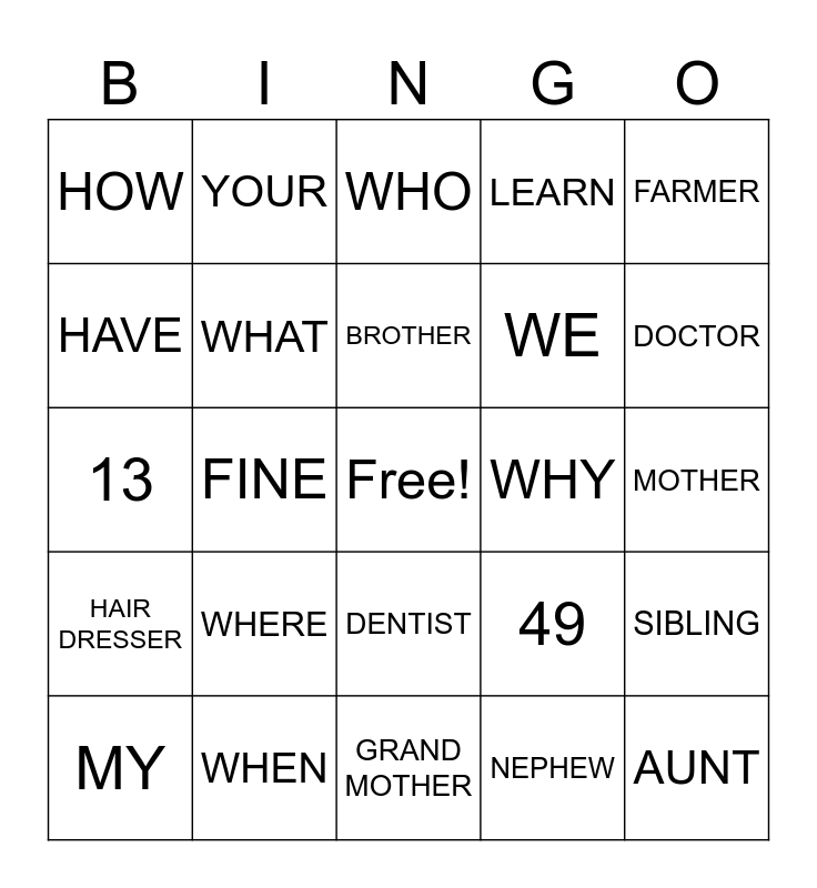 This bingo card has a free space and 29 words: MY, I, FINE, GOOD, HOW, WHO, WHAT, WHERE, WHY, WHEN, MOTHER, AUNT, GRAND MOTHER, NEPHEW, DOCTOR, TEACHER, DENTIST, HAIR DRESSER, FARMER, 13, 49, 100, WE, HAVE, LEARN, YOUR, SIBLING, BROTHER and SON.