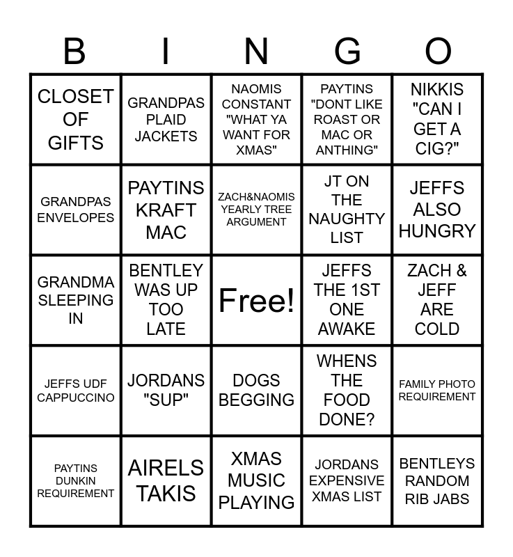 This bingo card has a free space and 49 words: GRANDMAS GOTTA UBER, NAOMIS 50 PACKAGES, ZACHS "NAP TIME", JORDANS EXPENSIVE XMAS LIST, ZACH & JEFF ARE COLD, NAOMIS XMAS MELTDOWN, GRANDPAS PLAID JACKETS, THE BOYS WRESTLING, JT ON THE NAUGHTY LIST, "IS BILLY COMING?", GRANDPAS ENVELOPES, BENTLEY WAS UP TOO LATE, WHENS THE FOOD DONE?, BENTLEYS RANDOM RIB JABS, NAOMIS EXTREME CLEANING, ZACHS HUNGRY, NAOMIS CONSTANT "WHAT YA WANT FOR XMAS", JEFFS THE 1ST ONE AWAKE, WHO'S ON DISHES?, CLOSET OF GIFTS, AIRELS TAKIS, XMAS MUSIC PLAYING, PAYTINS "DONT LIKE ROAST OR MAC OR ANTHING", NIKKIS "CAN I GET A CIG?", ZACHS "WRAP THIS 4 ME", JORDANS "SUP", ZACH&NAOMIS YEARLY TREE ARGUMENT, NAOMI & ZACHS "LETS GO LOOK AT LIGHTS", FAMILY PHOTO REQUIREMENT, JEFFS UDF CAPPUCCINO, BENTLEYS "SO WATCHYA GETTING ME", DOGS BEGGING, NAOMIS GETTING WINE, AIRELS "ZAAACH, STOP!", PAYTINS DUNKIN REQUIREMENT, GRANDPAS COFFEE, GRANDMAS XMAS EVE SHOPPING, ZACHS WILD TURKEY, JEFFS ALSO HUNGRY, ZACH&JEFFS SAFETY MEETING, BAKED MAC & CHEESE REQUIREMENT, NAOMIS XMAS GAMES, AIRELS QUIETNESS, GRANDMAS SELFIE STICK, GRANDMA SLEEPING IN, PAYTINS KRAFT MAC, BENTLEYS "JUST MONEY" REQUEST, GRANDPAS SUDDEN DISAPPEARANCE and A XMAS EVE CHRISTMAS.