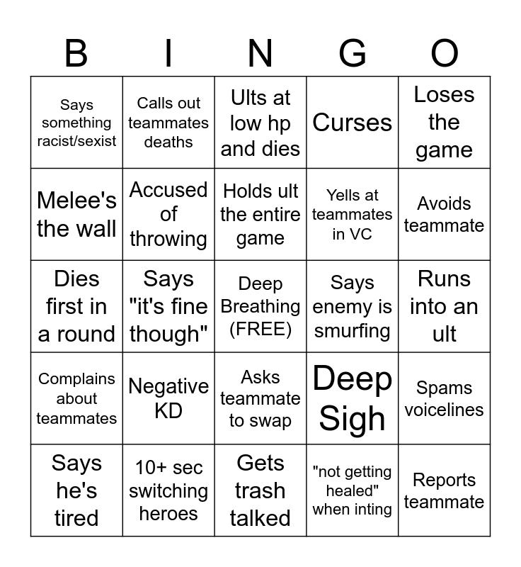 This bingo card has a free space and 24 words: Negative KD, 10+ sec switching heroes, Holds ult the entire game, Says he's tired, Loses the game, Says something racist/sexist, Melee's the wall, Calls out teammates deaths, Says enemy is smurfing, Asks teammate to swap, Yells at teammates in VC, Dies first in a round, Deep Sigh, Spams voicelines, Accused of throwing, "not getting healed" when inting, Runs into an ult, Ults at low hp and dies, Avoids teammate, Says "it's fine though", Reports teammate, Complains about teammates, Curses and Gets trash talked.