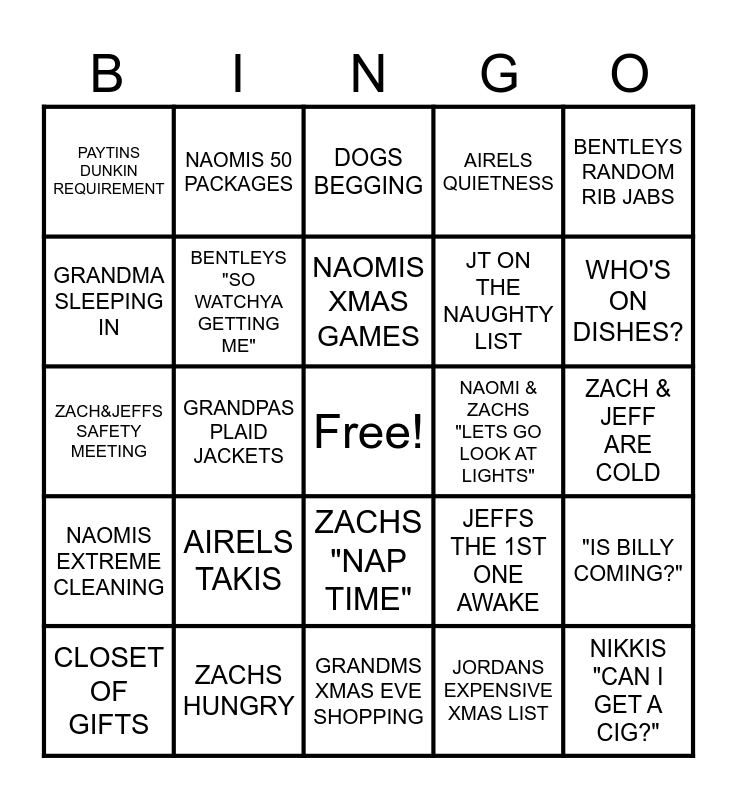This bingo card has a free space and 49 words: GRANDMAS GOTTA UBER, BAKED MAC & CHEESE REQUIREMENT, THE BOYS WRESTLING, JORDANS EXPENSIVE XMAS LIST, ZACH & JEFF ARE COLD, GRANDPAS ENVELOPES, NAOMIS 50 PACKAGES, NAOMIS CONSTANT "WHAT YA WANT FOR XMAS", JT ON THE NAUGHTY LIST, GRANDMAS SELFIE STICK, GRANDMA SLEEPING IN, GRANDPAS PLAID JACKETS, JEFFS THE 1ST ONE AWAKE, NIKKIS "CAN I GET A CIG?", ZACHS "WRAP THIS 4 ME", JORDANS "SUP", DOGS BEGGING, NAOMI & ZACHS "LETS GO LOOK AT LIGHTS", FAMILY PHOTO REQUIREMENT, PAYTINS DUNKIN REQUIREMENT, ZACHS HUNGRY, GRANDMS XMAS EVE SHOPPING, AIRELS QUIETNESS, BENTLEYS RANDOM RIB JABS, NAOMIS XMAS MELTDOWN, AIRELS TAKIS, NAOMIS XMAS GAMES, GRANDPAS SUDDEN DISAPPEARANCE, "IS BILLY COMING?", NAOMIS EXTREME CLEANING, GRANDPAS COFFEE, ZACHS "NAP TIME", NAOMIS GETTING WINE, JEFFS ALSO HUNGRY, CLOSET OF GIFTS, PAYTINS KRAFT, XMAS MUSIC PLAYING, WHEN IS THE FOOD DONE?, WHO'S ON DISHES?, JEFFS UDF CAPPUCCINO, BENTLEY WAS UP TOO LATE, ZACH & NAOMIS YEARLY TREE ARGUMENT, ZACHS WILD TURKEY, A XMAS EVE CHRISTMAS, ZACH&JEFFS SAFETY MEETING, BENTLEYS "SO WATCHYA GETTING ME", BENTLEYS "JUST MONEY" REQUEST, PAYTINS "DONT LIKE ROADT OR MAC OR ANYTHING" and AIRELS "ZAAACH, STOP!".