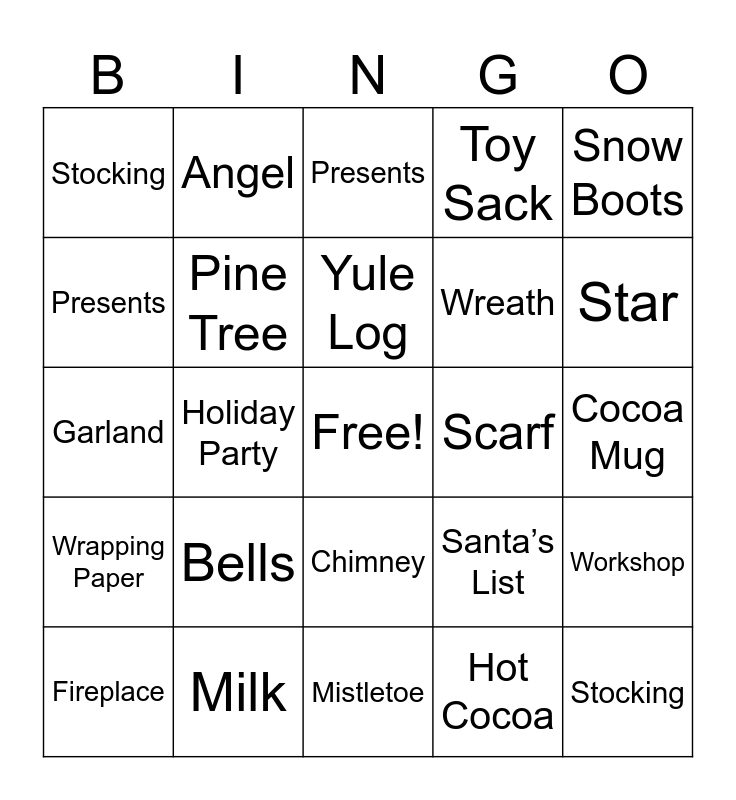 This bingo card has a free space and 51 words: Hot Cocoa, Stocking, Wreath, Mistletoe, Bells, Star, Angel, Fireplace, Presents, Wrapping Paper, Pine Tree, Toy Sack, Workshop, Santa’s List, Nice List, Naughty List, Yule Log, Scarf, Mittens, Snow Boots, Holiday Party, Hot Cocoa, Stocking, Wreath, Mistletoe, Bells, Star, Angel, Fireplace, Presents, Wrapping Paper, Ugly Sweater, Caroling, Frosty, Cookies, Milk, Snow Globe, Christmas Eve, Holiday Cheer, Peppermint, Cocoa Mug, Wrapping Paper, Sleigh, Jingle Bells, Nutcracker, Tinsel, Garland, Christmas Lights, North Pole, Chimney and Santa’s Hat.