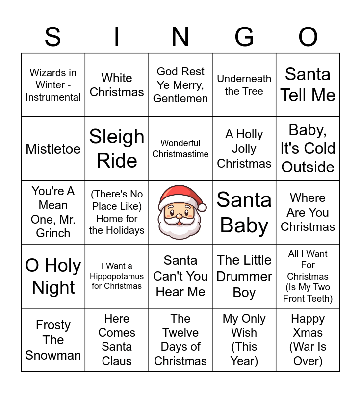 This bingo card has a free space and 84 words: It's the Most Wonderful Time of the Year, Step Into Christmas, God Rest Ye Merry, Gentlemen, Last Christmas, Have Yourself a Merry Little Christmas, Feliz Navidad, Grandma Got Run over by a Reindeer, Rockin' Around The Christmas Tree, Let It Snow! Let It Snow! Let It Snow!, All I Want for Christmas Is You, Run Rudolph Run, Deck The Hall, Sleigh Ride, Santa Baby, Rudolph the Red-Nosed Reindeer, Wizards in Winter - Instrumental, Frosty The Snowman, Mistletoe, We Need a Little Christmas, I Wish You A Merry Christmas, Please Come Home for Christmas, A Holly Jolly Christmas, Happy Xmas (War Is Over), Hey Santa Claus, (There's No Place Like) Home for the Holidays, Hark! The Herald Angels Sing, March Of The Wooden Soldiers, Up On The House Top, This Christmas, Mele Kalikimaka, I Want a Hippopotamus for Christmas, What Christmas Means To Me, Do You Hear What I Hear?, You're A Mean One, Mr. Grinch, Blue Christmas, I Saw Mommy Kissing Santa Claus, The Twelve Days of Christmas, Dominick the Donkey (The Italian Christmas Donkey), Baby, It's Cold Outside, O Holy Night, It's Beginning to Look a Lot Like Christmas, Mary, Did You Know?, Christmas (Baby Please Come Home), Do They Know It's Christmas?, Carol of the Bells, Santa Claus Is Comin' to Town, White Christmas, Jingle Bells, Silent Night, Christmas Time Is Here, Caroling, Caroling, The Little Drummer Boy, Underneath the Tree, The Chipmunk Song (Christmas Don't Be Late), Winter Wonderland, Dance of the Sugar Plum Fairy, Here Comes Santa Claus, Wonderful Christmastime, Happy Holiday / The Holiday Season, Where Are You Christmas, Silver Bells, Merry Christmas Darling, The First Noël, Little Saint Nick, Jingle Bell Rock, Joy to the World, O Come All Ye Faithful, O Christmas Tree, Santa Tell Me, A Marshmallow World, All I Want For Christmas (Is My Two Front Teeth), I'll Be Home For Christmas, Snowman, Christmas Tree Farm, Santa Can't You Hear Me, My Only Wish (This Year), Oh Santa!, Merry Christmas, Happy Holidays, Shake Up Christmas, The Christmas Song (Chestnuts Roasting), Believe, Someday At Christmas, Hot Chocolate and I Don't It To Be Christmas At All.