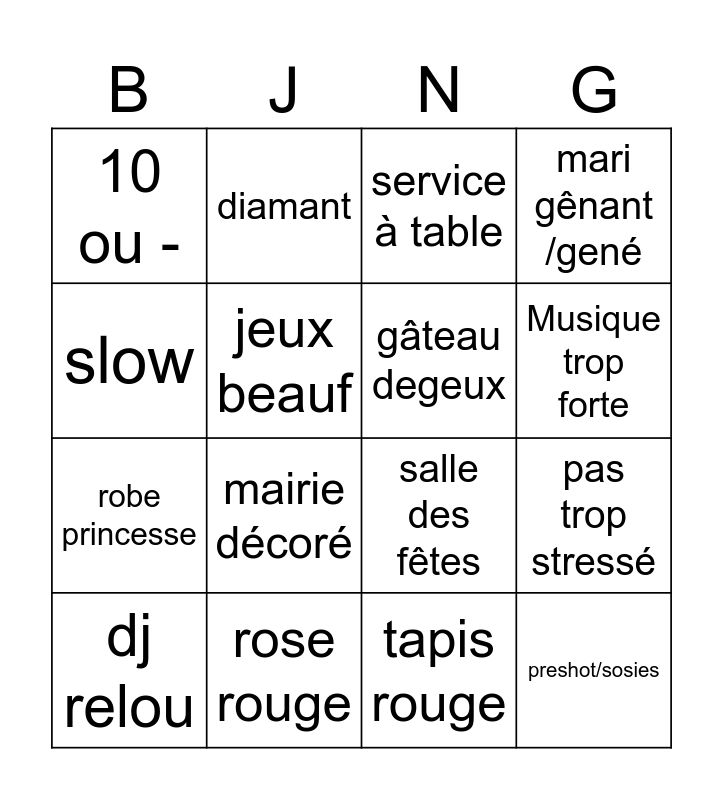This bingo card has 16 words: rose rouge, pas trop stressé, service à table, 10 ou -, robe princesse, diamant, salle des fêtes, tapis rouge, slow, jeux beauf, dj relou, mari gênant /gené, mairie décoré, Musique trop forte, gâteau degeux and preshot/sosies.