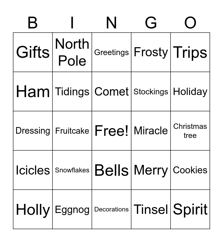 This bingo card has a free space and 89 words: Advent, Angels, Bells, Blitzen, Candles, Candy, Candy canes, Cards, Cedar, Celebrate, Ceremonies, Chimney, Cookies, Christmas tree, Cold, Comet, Cranberry sauce, Crowds, Cupid, Dancer, Dasher, December, Decorations, Donner, Dressing, Eggnog, Elves, Family reunion, Festival, Fir, Frosty, Fruitcake, Gift boxes, Gifts, Goodwill, Greetings, Ham, Happy, Holiday, Holly, Icicles, Jolly, Lights, Lists, Merry, Miracle, Mistletoe, New Year, Noel, North Pole, Pageant, Parades, Party, Pie, Pine, Plum pudding, Poinsettia, Prancer, Presents, Punch, Red/green, Reindeer, Ribbon, Rudolph, Sales, Scrooge, Season, Sled, Sleighbells, Snowflakes, Spirit, St. Nick, Star, Stockings, Tidings, Tinsel, Togetherness, Toys, Tradition, Traffic, Trips, Turkey, Vacation, Vixen, Winter, Worship, Wrapping paper, Wreath and Yuletide.